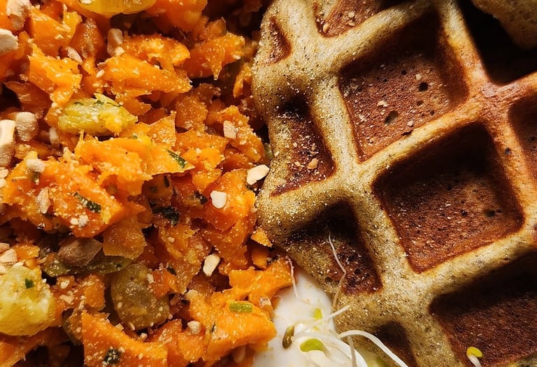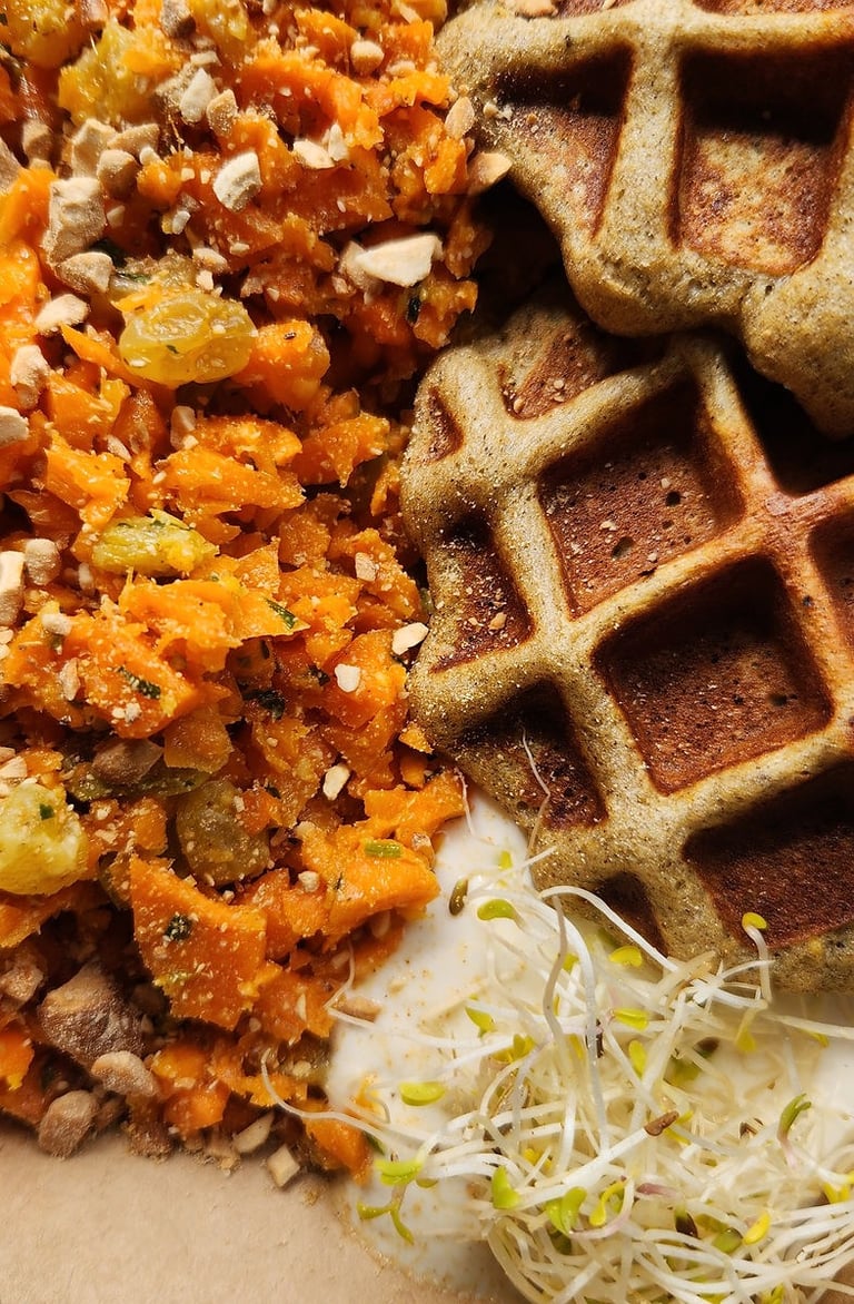 Gaufre aux légumes de saison, et graines de cumin, sans gluten (farine de sarrasin), servie avec sa sauce tahini, citron, fromage blanc et gingembre.